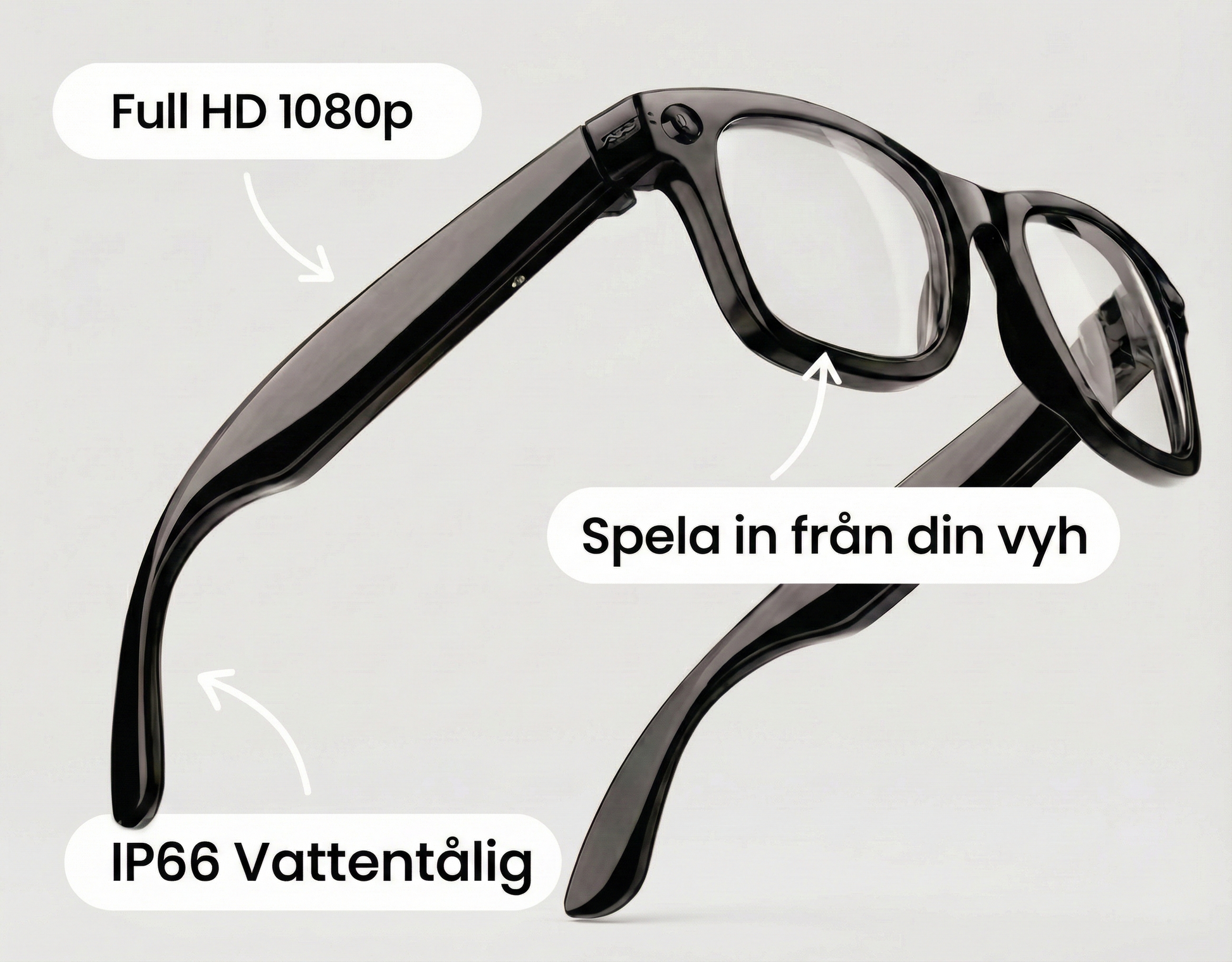 ClipGlasses spelar in i Full HD 1080p med en 5MP kamera och inbyggd EIS-stabilisering som eliminerar skakiga bilder. Dina minnen blir skarpa och proffsiga.